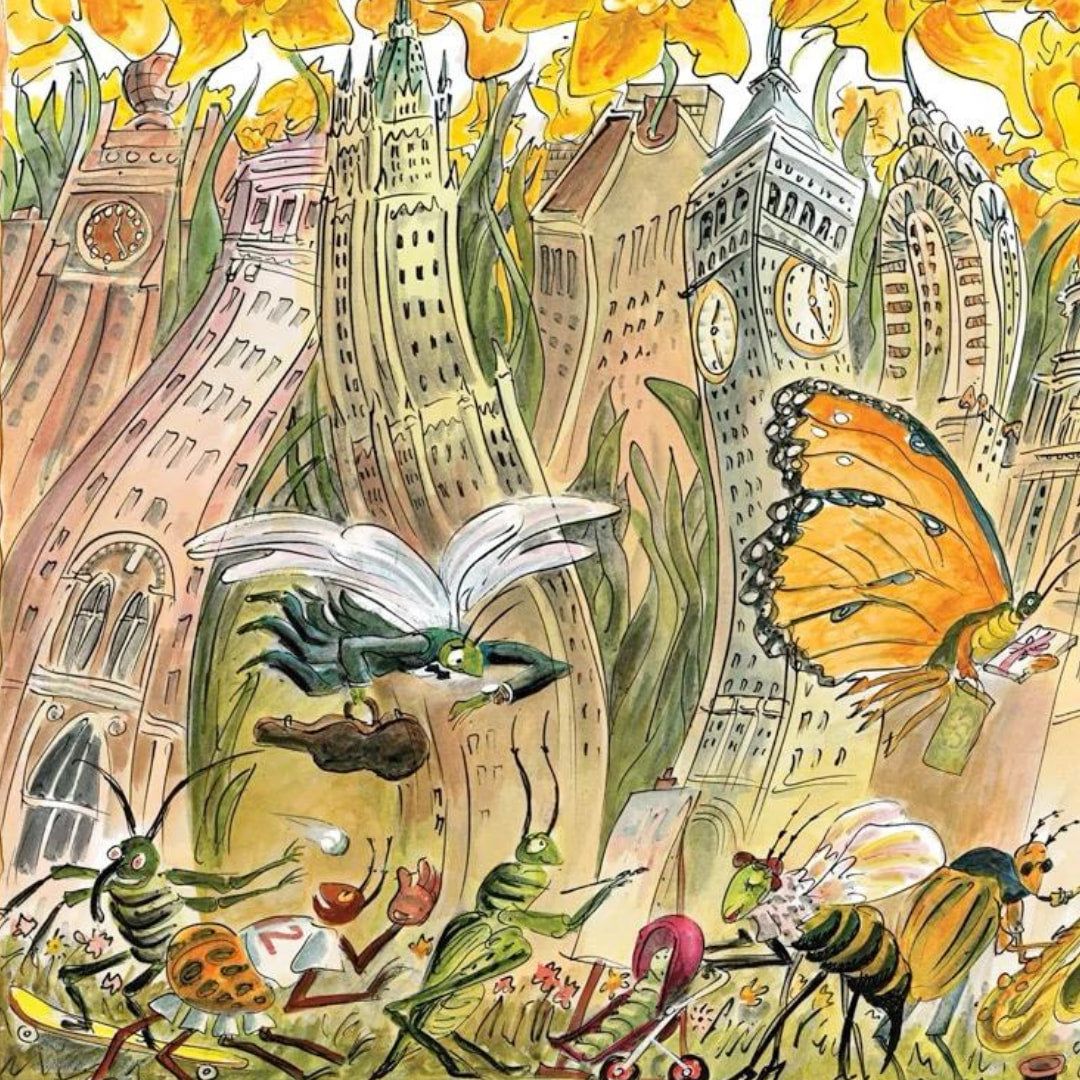Piece together this fantasy scene of anthropomorphized insects as typical human city dwellers going about their day in this 1500 piece jigsaw puzzle from New York Puzzle Company.